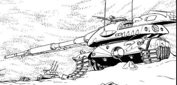 Tetsuro reads a newspaper from the library car discussing the discovery of the 5 rings of Uranus. He’s so engrossed in it that he just now realizes that the 999 has stopped at another station! The Conductor explains that they are at El Alamein, but only for 10 minutes, and they are asked to not stray far from the train. Maetel tells Tetsuro this is so he doesn’t get shot by the frightful archaic weapons that are there. Tetsuro thinks of how he has heard the name El Alamein before and Maetel claims it was a battlefield in North Africa where tanks once fought. The two of them head to the desert-like area outside, finding abandoned tanks all over the place. Tetsuro and Maetel wonder what types of lifeforms operated these weapons.